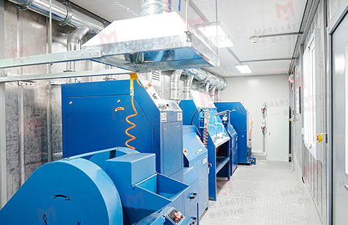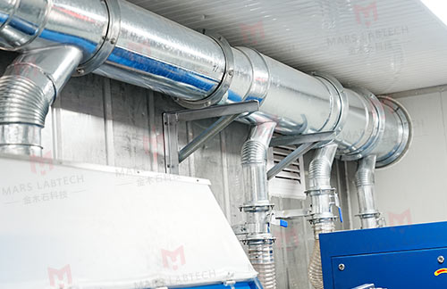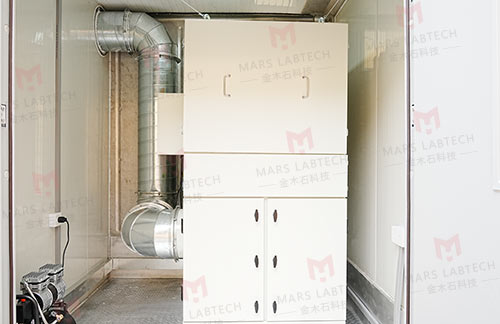 通风管道连接到所有样品制备设备,旨在从源头清除样品制备过程中产生的粉尘和颗粒物,并净化空气。安全是实验室建设过程中的重中之重。该系统采用脉冲式滤筒,有效保持实验室空气质量,清除粉尘,并确保操作人员安全。该集装箱实验室解决方案证明了金木石实验室的理解:恰当的设施设计直接影响测试准确性和人员安全。